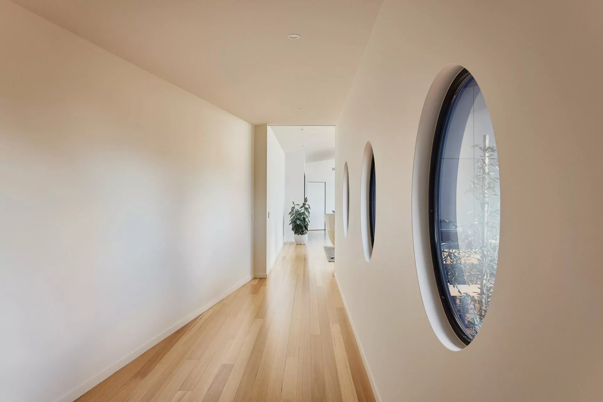 In harmony with the spectacular view, the kitchen and dining space keeps things pared back – sleek black joinery, matte finishes and soft timber tones throughout create a calm, practical backdrop to everyday living or entertaining with friends.The round windows found in the project break away from the home’s otherwise linear glazing, offering something unexpected, drawing in natural light and adding function, character and a subtle shift in rhythm that makes all the difference.