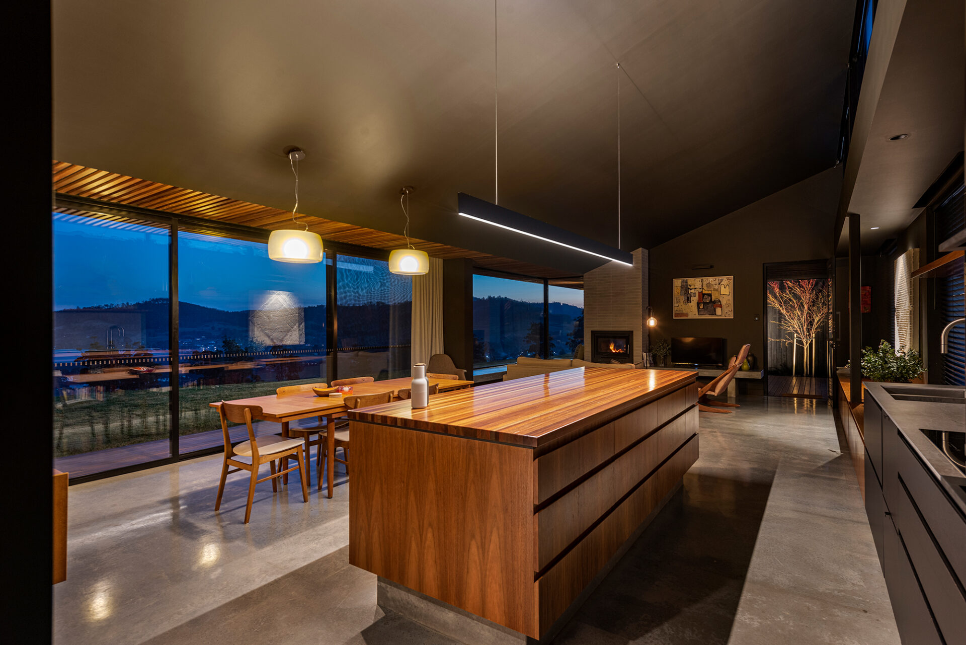 Nestled just below a picturesque ridge, this single-storey residence extends from east to west, offering breathtaking rural vistas that stretch southward over Port Cygnet and beyond, and invigorated by the crisp oxygen of the countryside. Clad in striking Shou sugi ban timber, its exterior sits as a shadow in the landscape, while lofty ceilings soar overhead, allowing ample northern sunlight to flood in through expansive clerestory windows, casting idyllic reflections of the surrounding hills and pastures.